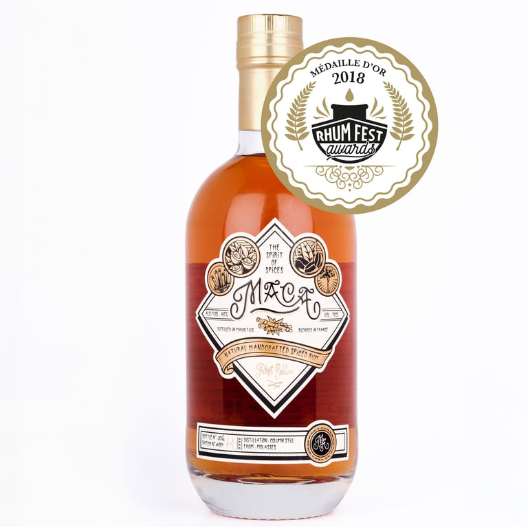 Avec sa base de rhum traditionnelle, sa rondeur et sa chaleur épicée persistante, Maca spiced Original est né de son amour pour le rhum et les épices. Il obtient en 2018 la médaille d’or du Rhum Fest Award.
